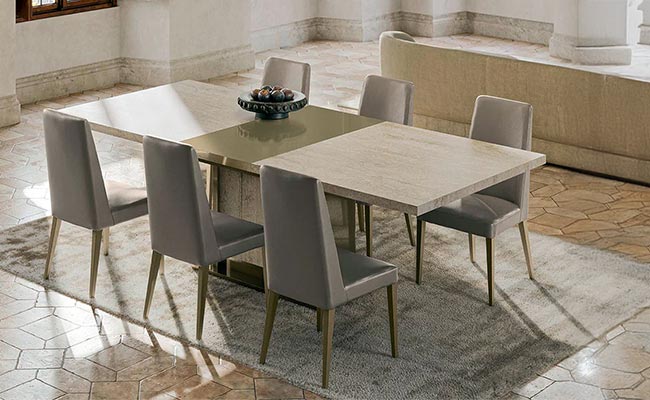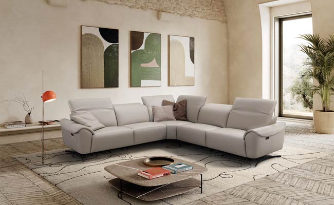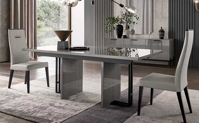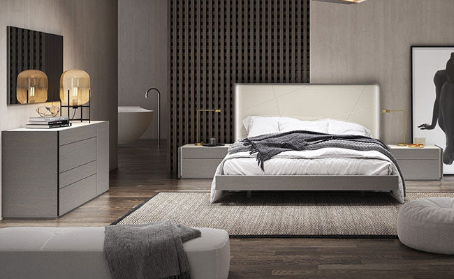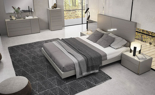 The Porto premium bedroom features an elegant design beautifully mixing a natural light grey lacquer finish which looks striking against the natural grey wood veneer. The headboard shows off uniquely carved diagonal lines which look spectacular when the built-in LED lights featuring a dimmer function are on. The interplay of grey with light grey continues in the nightstands, chest, and dresser.